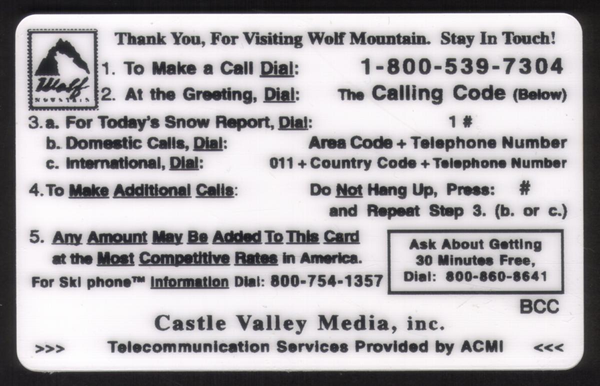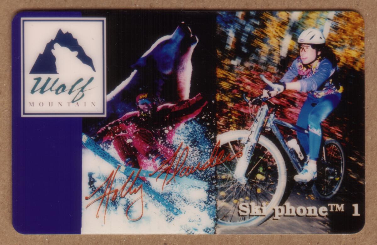 This collectible Skiphone card features imagery related to Wolf Mountain in Utah. On the left side, the card displays the Wolf Mountain logo, depicting a stylized mountain silhouette with the words "Wolf Mountain" beneath it. Next to the logo, there is an artistic depiction of a wolf’s head howling, set against a snowy or frosty background.