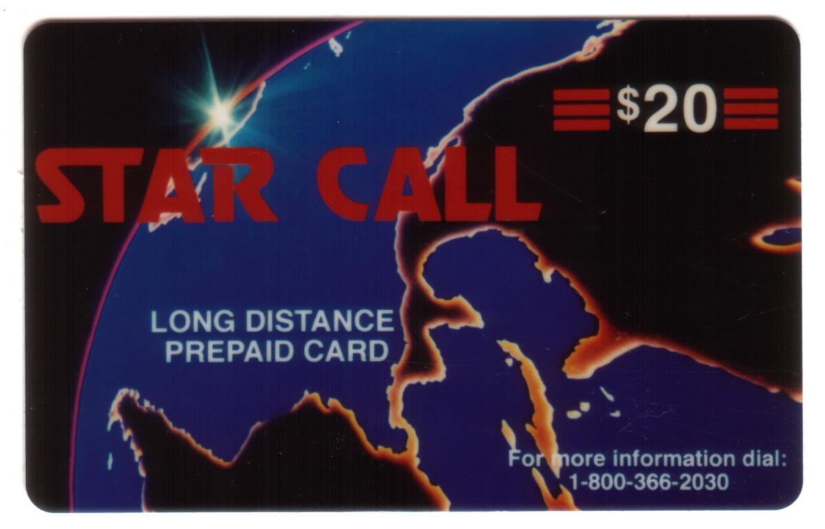 This card combines satellite imagery and geographic visuals of the Americas with branding information to clearly present its function as a prepaid long distance calling card named Star Call. The design emphasizes the global communication aspect by focusing on the view of Earth from space and associated satellite photography.