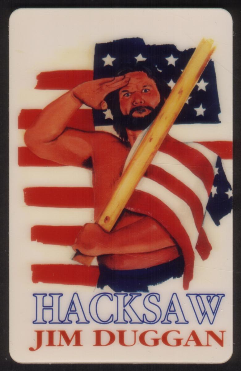 The text "HACKSAW" appears prominently at the bottom of the card in a bold blue font, with "JIM DUGGAN" written underneath in red capital letters. The style and subject associate the card with the World Wrestling Federation (WWF) and professional wrestling culture. The illustration was created by artist Wayne Prokopiak in 1995.