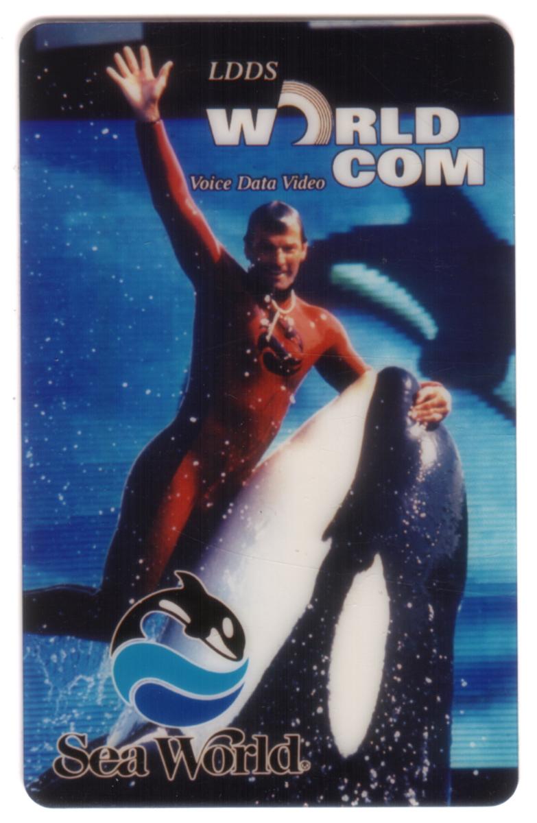 The background has a deep blue hue with water droplets adding to the aquatic scene’s dynamic feel. The top part of the card includes the text "LDDS WorldCom" with the phrase "Voice Data Video" underneath, indicating the card's issuer. At the bottom left corner, the Sea World logo is displayed, featuring an orca graphic above the text "Sea World."