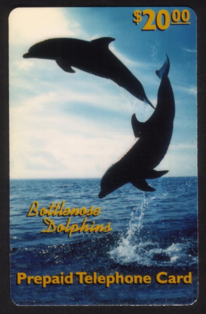 The card has the denomination "$20.00" prominently displayed in the upper right corner. The words "Bottlenose Dolphins" appear in yellow script font near the lower left, while "Prepaid Telephone Card" is printed in yellow block letters at the bottom center.