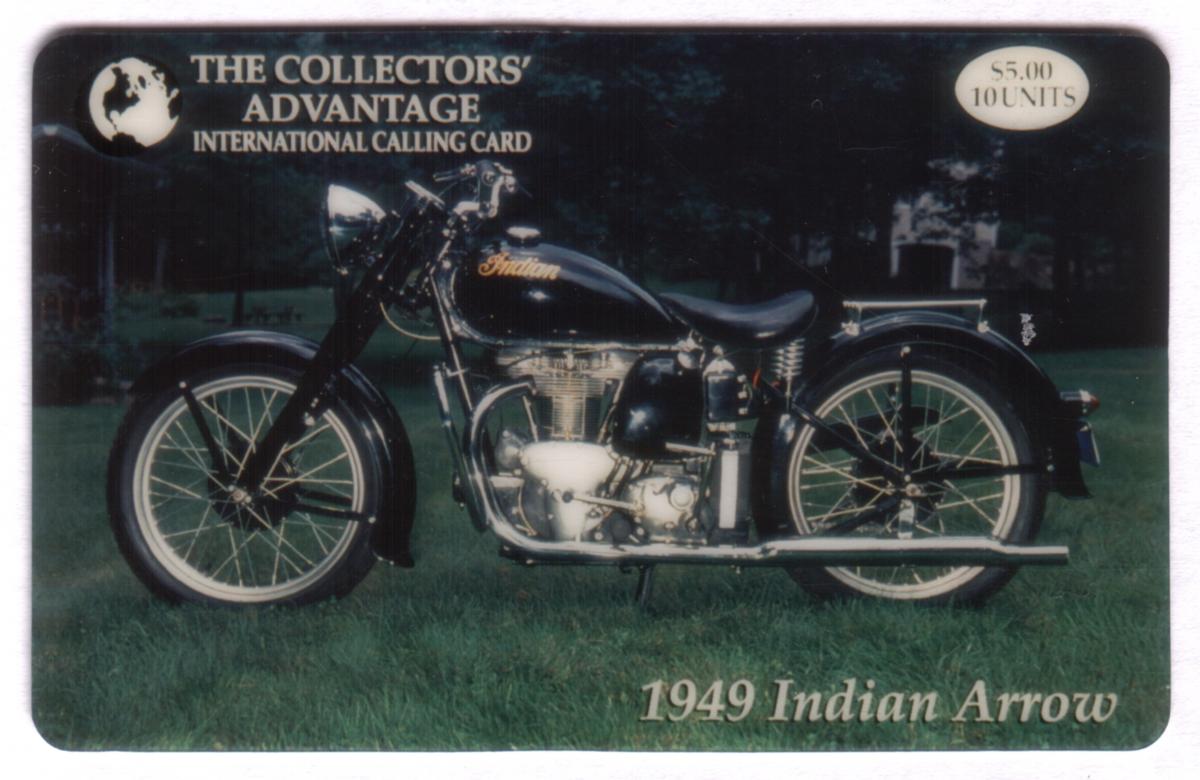 This collectible international calling card features a detailed image of the 1949 Indian Arrow motorcycle, prominently displayed against a natural outdoor background with grass and dark foliage. The motorcycle is black with chrome and polished metal parts, showcasing classic design elements such as its curved fuel tank, spoked wheels, and visible engine components. The word "Indian" is clearly displayed in gold script on the motorcycle’s fuel tank.