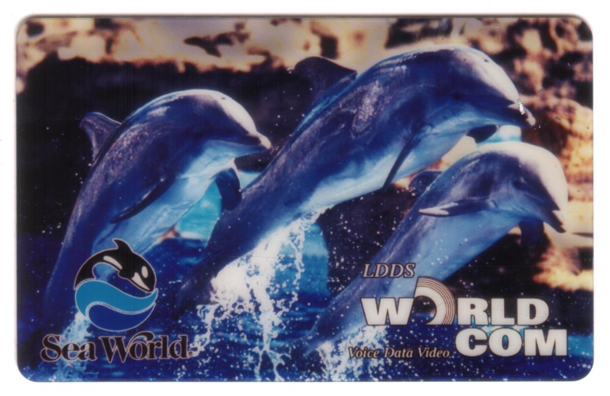 On the right side of the card, the text reads "LDDS WORLD COM" with "WORLD COM" in large bold letters, while "LDDS" is positioned above it. Beneath "WORLD COM," smaller text states "Voice Data Video," highlighting the communication services connected to the card. Additional text at the bottom center notes "20u Sea World: Three Dolphins Jumping 3/95 SPECIMEN," indicating this card’s issue date as March 1995 and identifying it as a specimen.