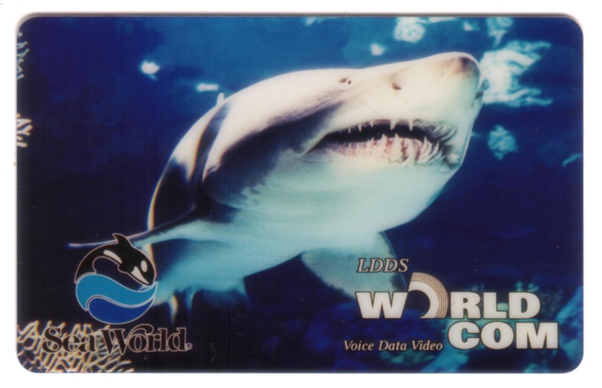 Overall, the card emphasizes a theme of marine life, wildlife, and aquatic animals, featuring both the image of the ominous shark and the branding elements of Sea World and WorldCom.