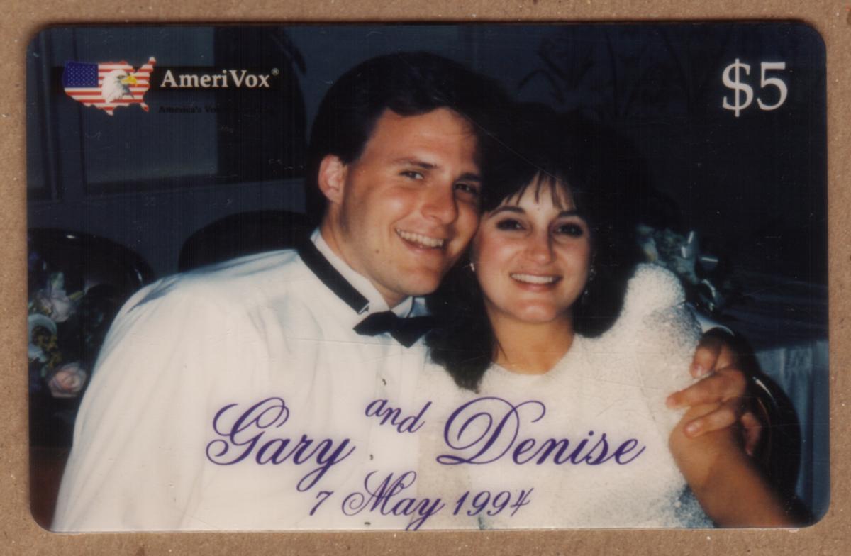 This collectible AmeriVox telephone card features a photograph of a smiling couple named Gary and Denise dressed in wedding attire. Gary wears a white dress shirt with a black bow tie, and Denise is in a white bridal gown holding a bouquet of white flowers. Their names, "Gary and Denise," are prominently printed in elegant script lettering along with the date "7 May 1994," indicating the occasion of their marriage.