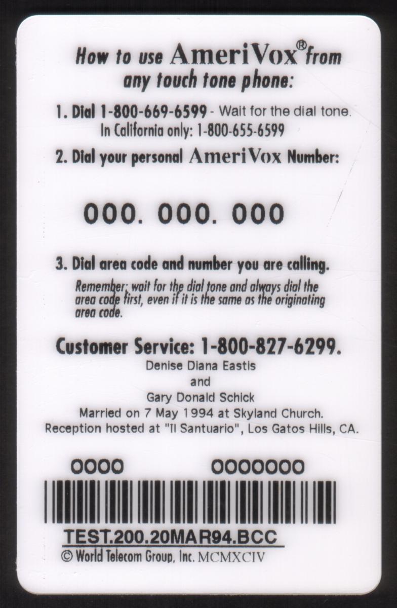 Keywords: Promotionals, Amerivox Directors, telephone card industry, telephone cards, telecard industry, telecards, amerivox representatives, marriages, gary & denise Schick, denise diana eastis, gary donald schick, skyland church, california, AmeriVox