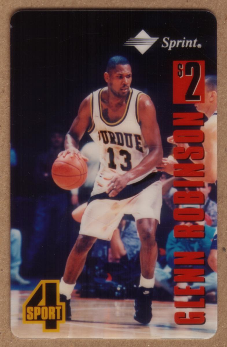 This phone card is part of the 4-Sport Series and highlights Glenn Robinson’s time playing basketball at Purdue University. The card merges a collectible sports theme with telecommunications branding.