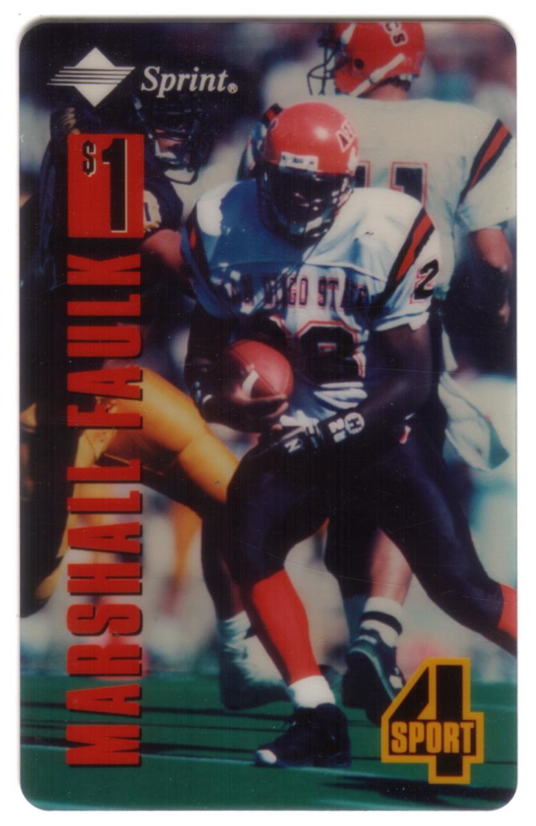 This collectible phone card features an action photograph of Marshall Faulk, a football player, dressed in a white jersey with the number 2 and the text "San Diego St." across the chest. He is holding a football and appears to be running during a game, with other players and a referee visible in the background. The card’s prominent color scheme for text includes bright red and black on the left side, with the name "MARSHALL FAULK" written vertically in large, bold letters. The denomination "$1" is displayed above his name.