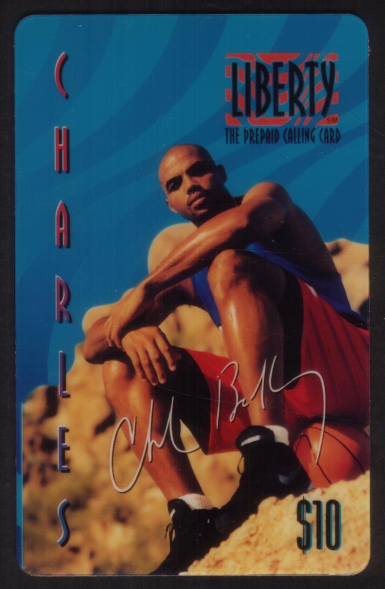 The card displays the word "LIBERTY" in bold red letters near the top right corner, with the subtitle "THE PREPAID CALLING CARD" in smaller black text beneath it. Along the left side of the card, "CHARLES" is printed vertically in red capital letters with a black outline. Charles Barkley’s name appears prominently across the middle of the card in a white signature-style font.