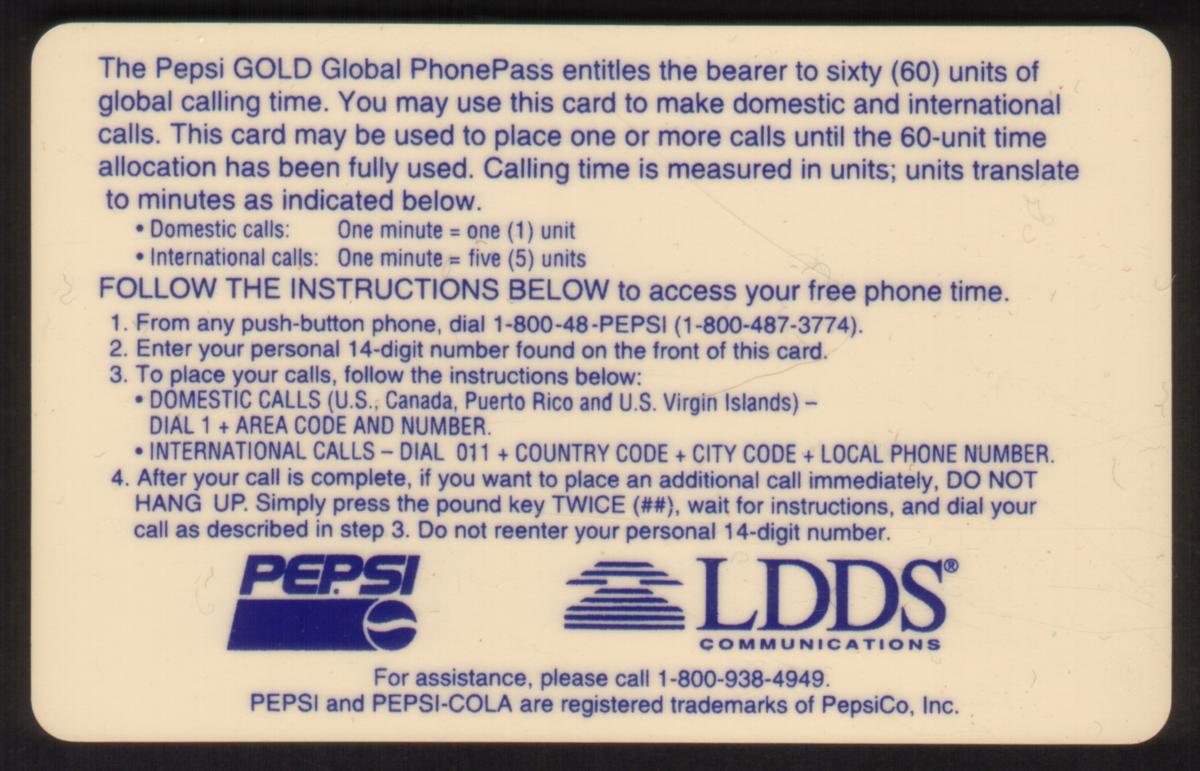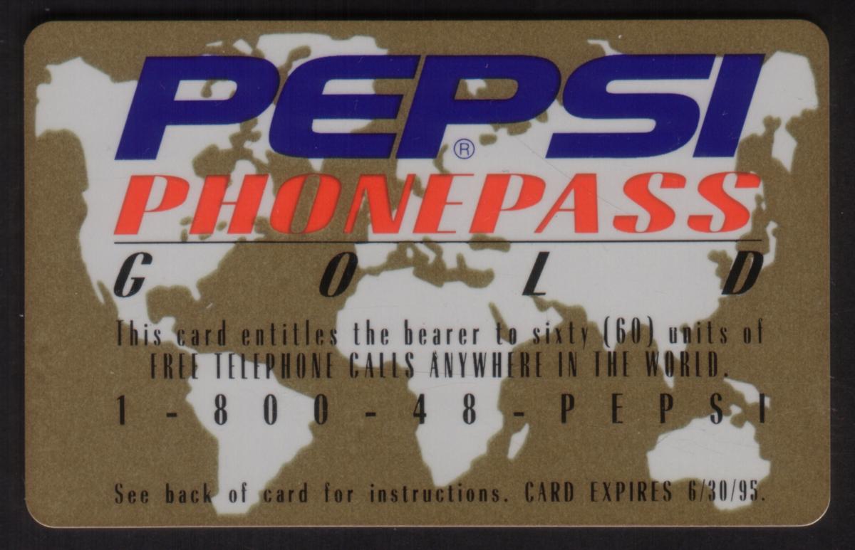The card entitles the bearer to sixty (60) units of free telephone calls anywhere in the world. The toll-free number "1-800-48-PEPSI" is prominently displayed in black text in the center of the card for calling.