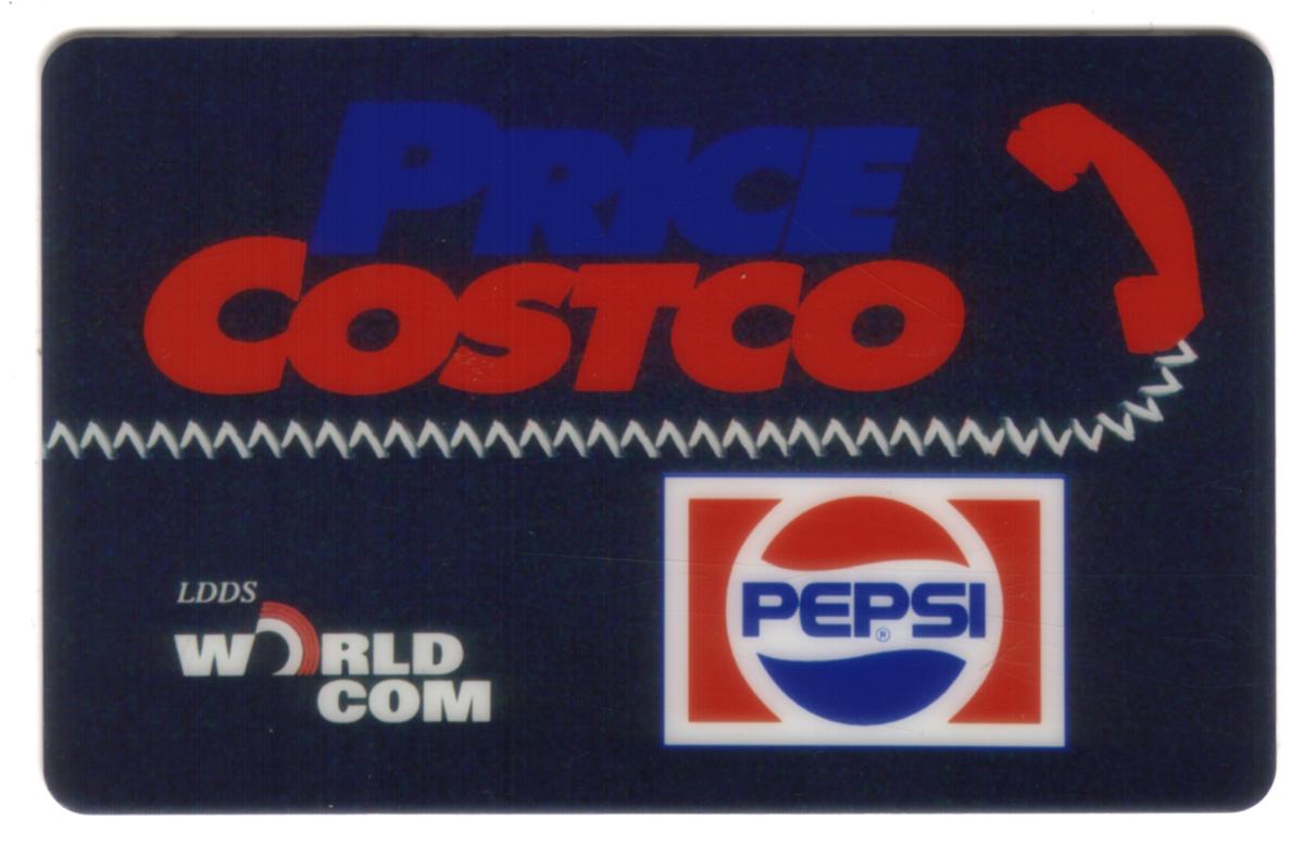 The overall design reflects promotional branding for Pepsi Cola in connection with Costco pricing, incorporating telephony imagery that relates to the card's purpose as a phone card issued by WorldCom.