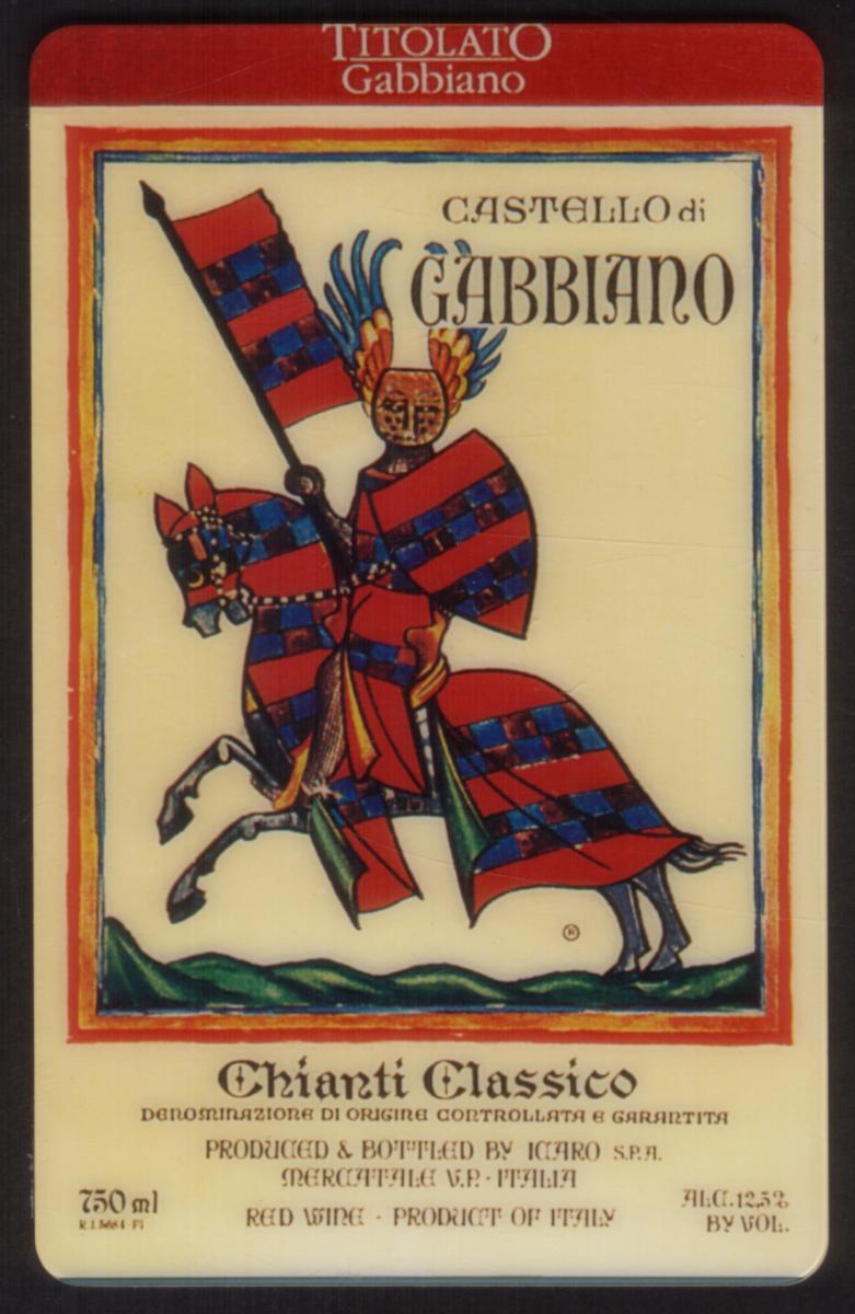 Above the knight, the words "CASTELLO di GABBIANO" are printed in a classic serif font, positioned prominently near the top right of the image. The bottom section of the card provides detailed wine information: "Chianti Classico" is printed in a decorative font, followed by the Italian designation "Denominazione di Origine Controllata e Garantita." Additional labeling shows that the wine is produced and bottled by Icaro S.p.A. in Greve in Chianti, Italy. The label specifies the volume as "750 ml," the alcohol content as "ALC. 12.5% BY VOL.," and identifies the wine as red.