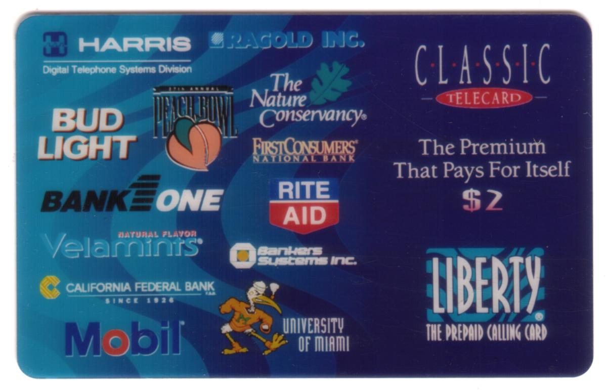 Prepaid telecommunications card featuring logos from Harris, Bud Light, Bank One, Rite Aid, University of Miami, Mobil, and eco-friendly themes. |
