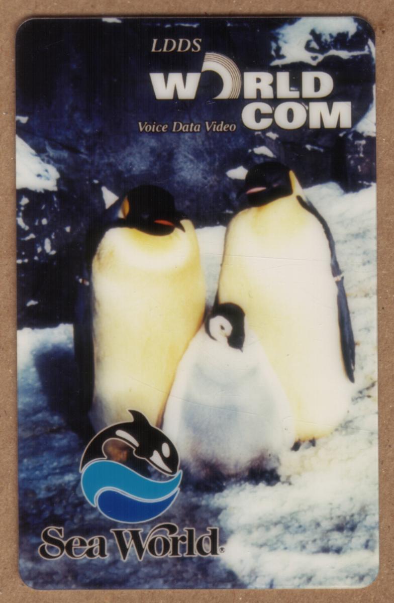 The text on the card includes "LDDS," "WorldCom," and "Voice Data Video" near the top. At the bottom, the Sea World logo is visible, depicting an orca whale partially submerged in stylized blue water. The card also has the date "03/95" and the label "SPECIMEN" printed on it.