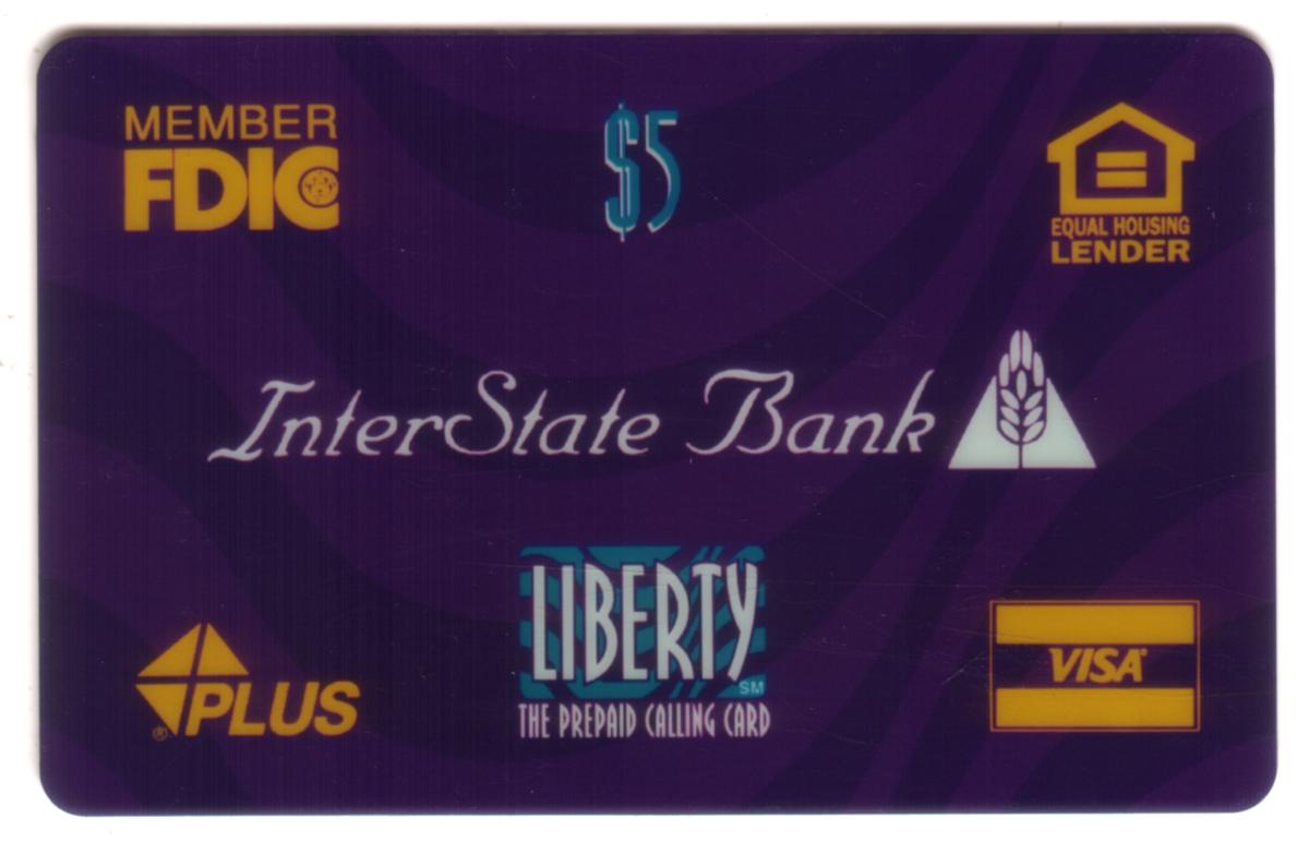Purple prepaid calling card featuring InterState Bank, Visa, and FDIC logos, with $5 value, emphasizing trust, banking, and telecommunications functionality. |