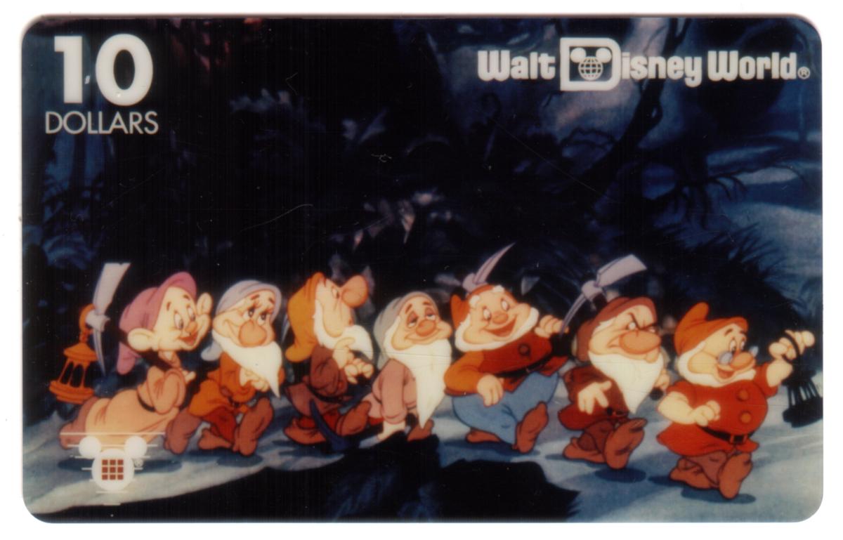 In the upper right corner, the card displays the "Walt Disney World" logo, highlighting its connection to the Orlando, Florida theme park. The value “10 DOLLARS” is shown prominently in white text at the top left corner. The overall design blends vibrant character art with a dark, atmospheric background scene, emphasizing the dwarfs’ journey.