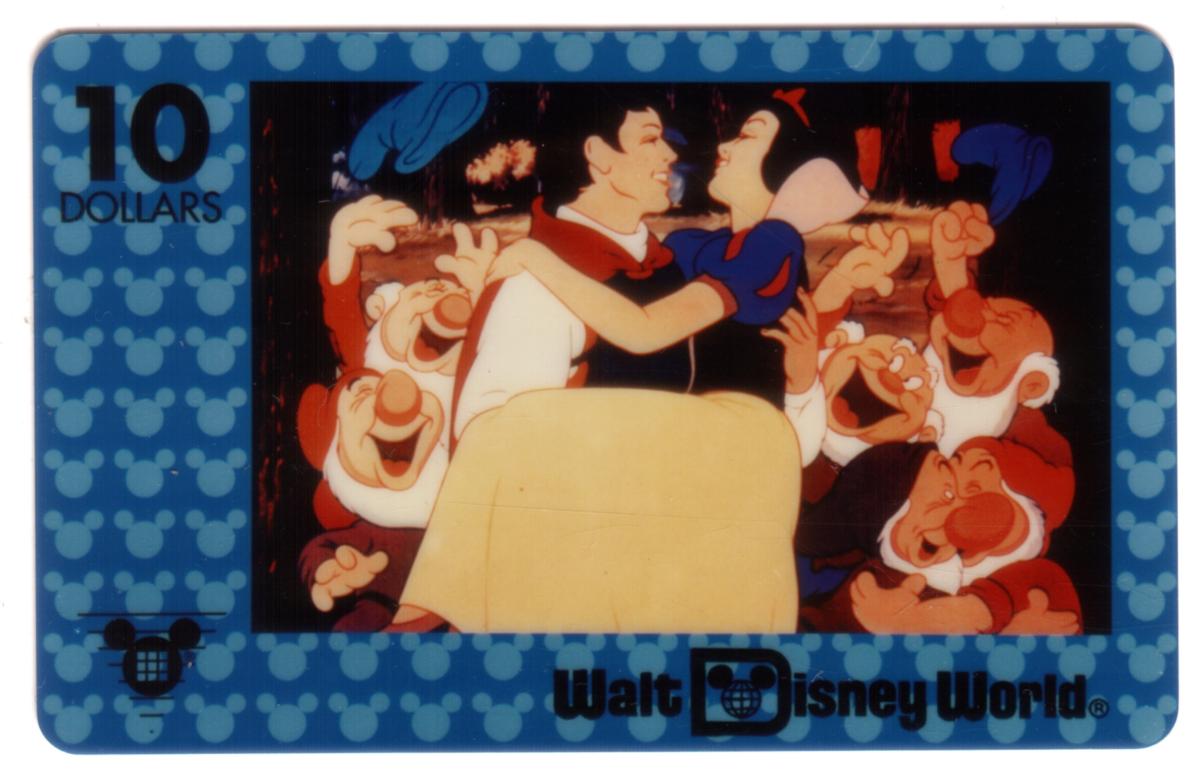 One card shows Snow White embracing Prince Charming, surrounded by the Seven Dwarfs, set against a blue Mickey Mouse head patterned border. Another card presents a group photo with Snow White accompanied by Mickey Mouse, Minnie Mouse, Pluto, Goofy, Cinderella, Prince Charming, and Mary Poppins in front of Cinderella Castle at Walt Disney World. This card has an orange border with white Mickey Mouse heads.