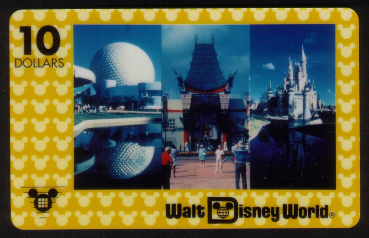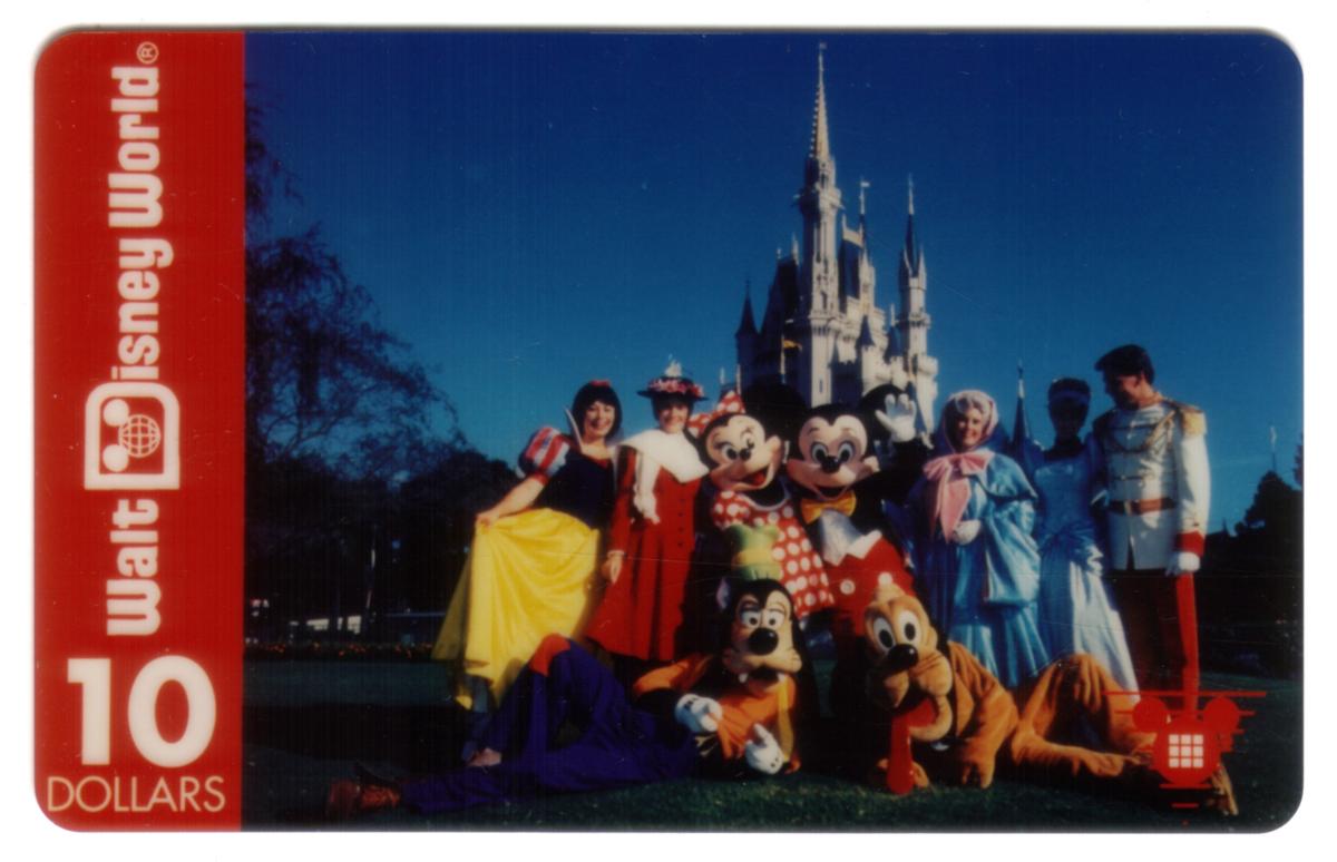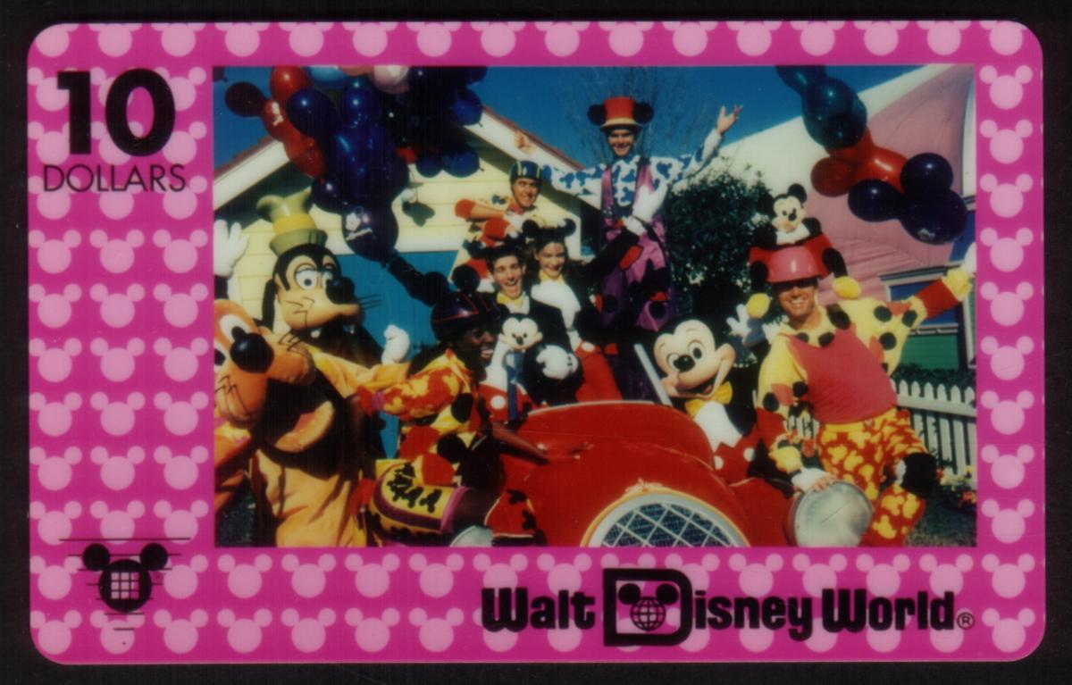 This collection features a set of nine Walt Disney World prepaid calling cards, each with a value of 10 dollars. The cards display various iconic Disney images, with borders designed in different colors featuring a repeating Mickey Mouse head pattern. The phrase "Walt Disney World" appears on each card, accompanied by a castle-shaped calling card symbol.