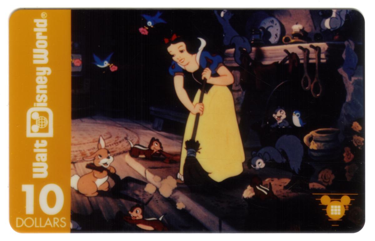 Additional cards feature close-up scenes from "Snow White and the Seven Dwarfs." One shows Snow White sweeping the floor in a cottage with woodland animals nearby, bordered in orange. Another card presents Snow White with the Seven Dwarfs posing in bright daylight with Cinderella Castle in the background, surrounded by a turquoise Mickey Mouse head border. Another card illustrates the Seven Dwarfs walking through a forest scene with a dark blue background.