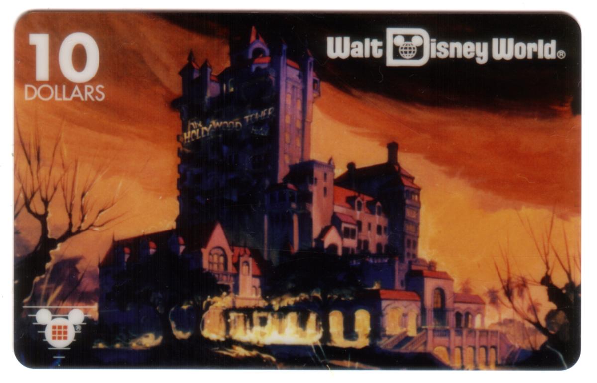 The last card portrays the Twilight Zone Tower of Terror with an ominous orange and black sky background, highlighted by a white Mickey Mouse head calling card symbol. The overall theme connects Walt Disney World characters and attractions, capturing the park’s magic and nostalgia through classic animation and landmark imagery.