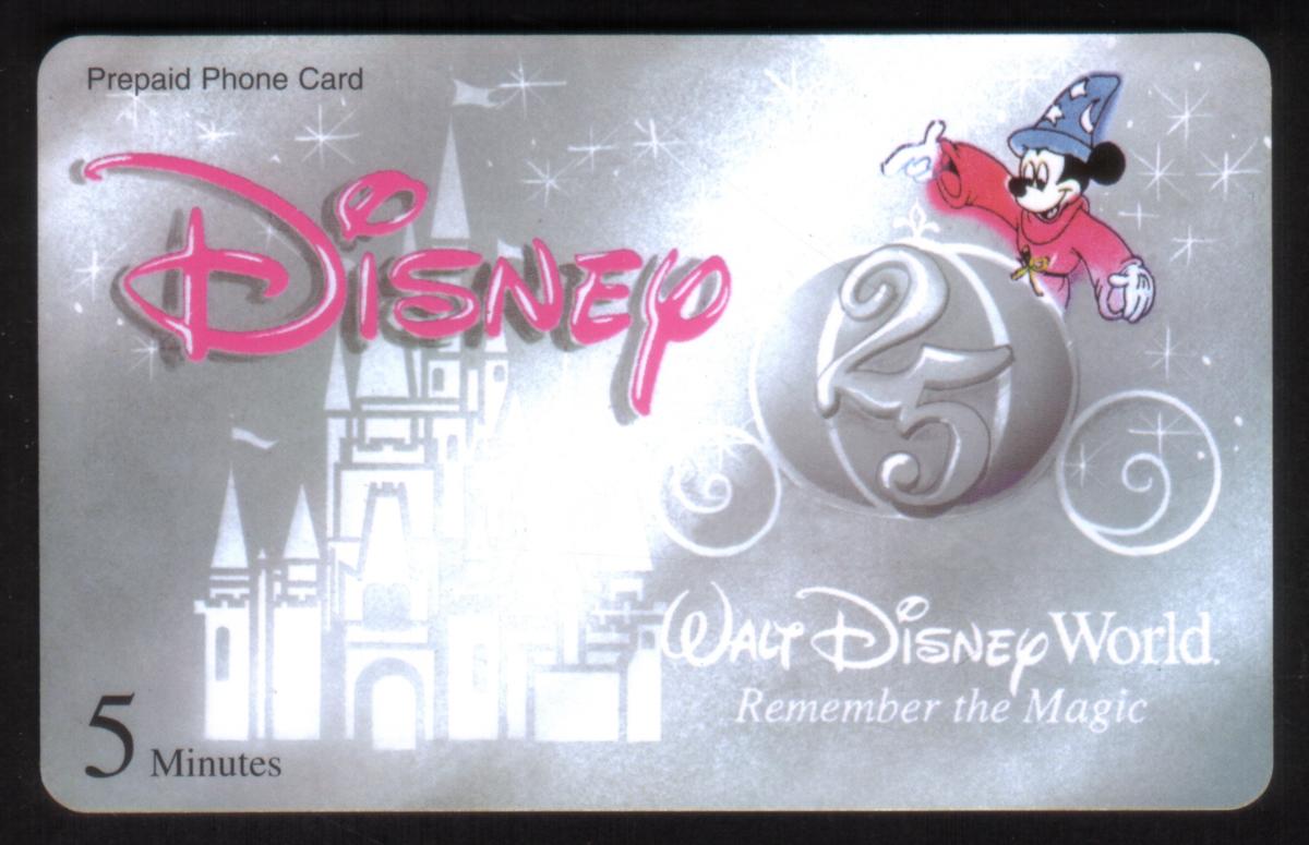 This prepaid phone card features a Disney theme celebrating the 25th anniversary of Walt Disney World. The card's background is silver with a faint image of Cinderella Castle in gray tones, positioned slightly left of center. The iconic "Disney" logo appears prominently in bright pink across the upper left portion of the card.