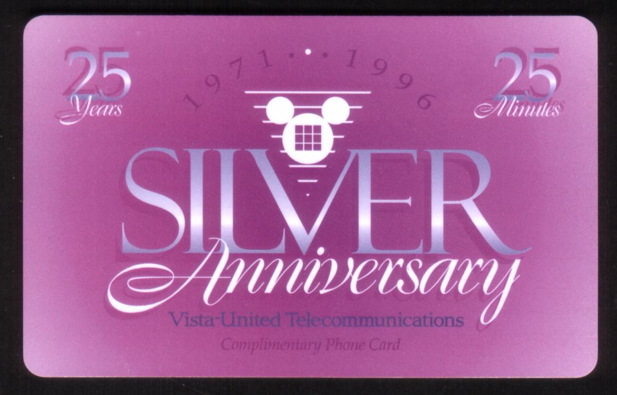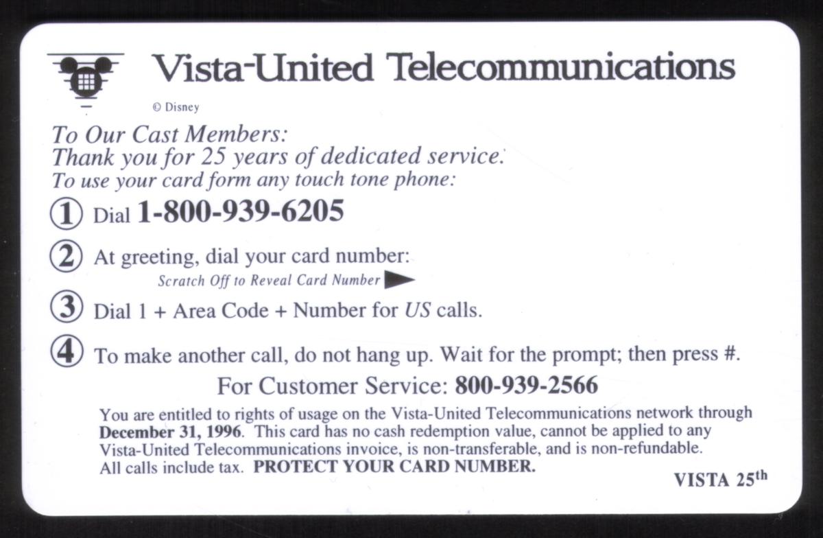 This phone card represents a special edition issued by Vista-United (Disney) and reflects the link between Walt Disney World and Walt Disney Land theme parks, major attractions, and amusement parks. It serves as a tribute to 25 years of providing Disney’s quality and innovation in telecommunications services.
