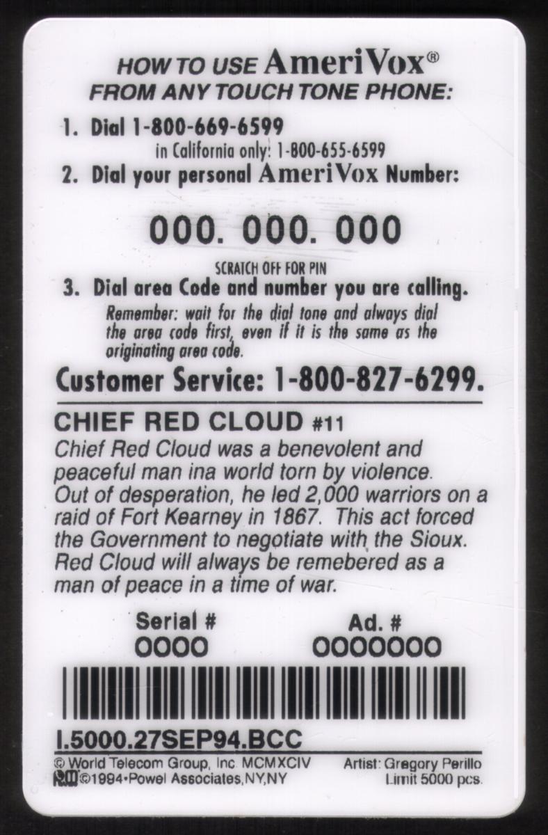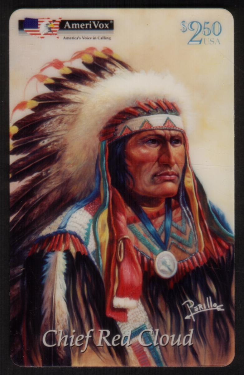 The card is issued by AmeriVox, which is marked in the top left corner along with an American flag and eagle logo. The value of the card is printed in the top right corner as $2.50 in U.S. currency. At the bottom of the card, the name “Chief Red Cloud” is clearly printed in white text, reinforcing the identity of the figure portrayed.