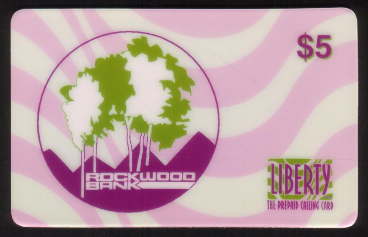 This item is associated with financial institutions and banking services, specifically promoting Rockwood Bank, a community bank from Saint Louis, Missouri. The design incorporates natural elements like trees and mountains as part of the bank’s branding, reflecting a connection to its local environment. The card serves as a promotional item linking financial services with prepaid calling functionality.