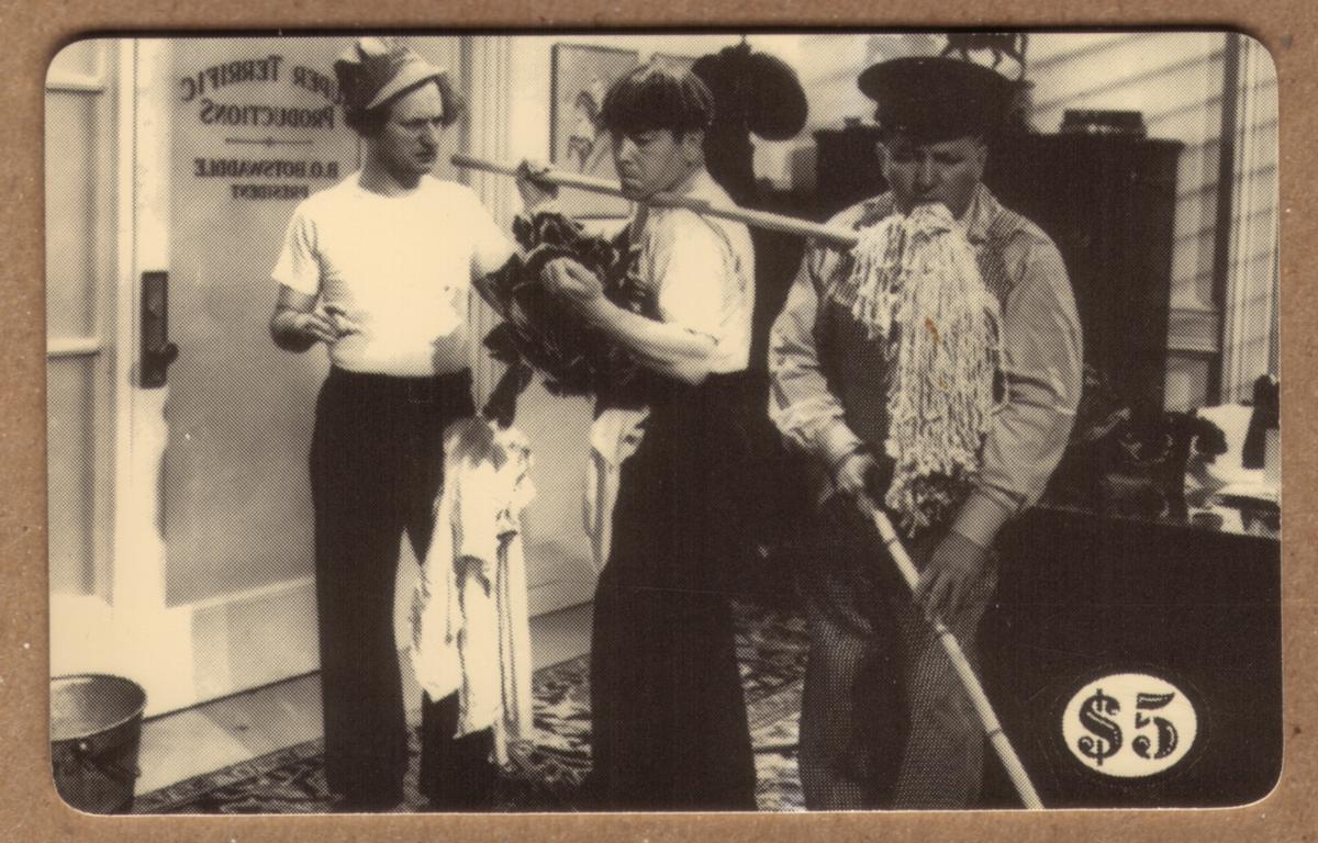 The card prominently displays the denomination "$5" in the lower right corner within a white circular background. The image captures the trio inside a room with a patterned rug on the floor and a door with signage behind them, indicating an indoor set typical of the era’s classic comedy films. The characters are dressed in period-appropriate work clothes, reflecting the cleaning theme in the comedic sketch.