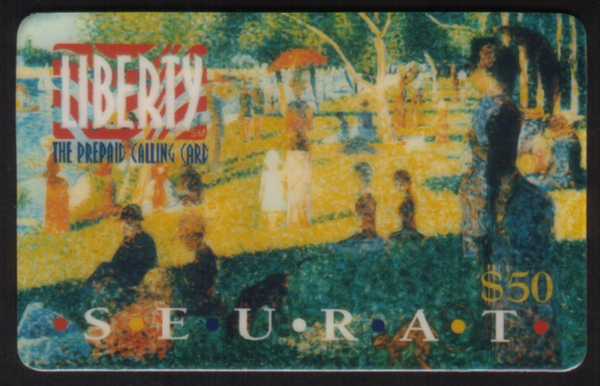 The artwork is rendered with visible pointillism technique, capturing the vibrant colors and light effects characteristic of Seurat's masterpiece. This card merges fine arts and functional collectible phone card features, appealing to enthusiasts of both art and telecommunication memorabilia.