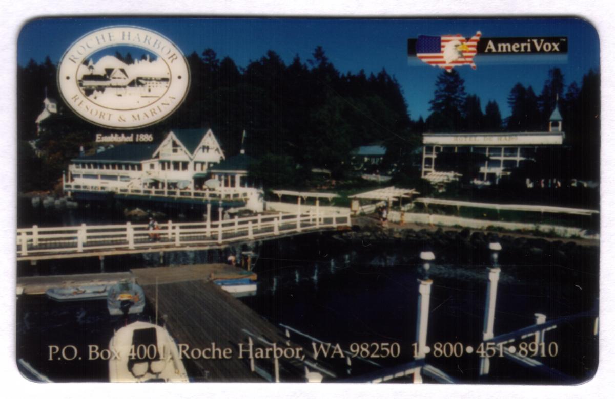 The card displays the Roche Harbor Resort & Marina logo in the upper left corner, depicting a white sailboat and waterfront buildings encircled by text reading "Roche Harbor Resort & Marina Established 1886." The AmeriVox logo appears in the upper right corner, accompanied by a small American flag. Contact details at the bottom of the card include a P.O. Box address in Roche Harbor, Washington 98250, and a toll-free phone number: 1-800-451-8910.