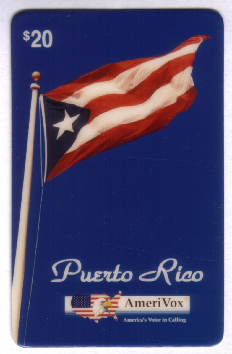 Below the flag image, the words "Puerto Rico" are written in a white cursive font. Beneath this text, there is a logo for AmeriVox with a small image of the mainland United States overlaid with an American flag pattern. The AmeriVox tagline "America's Voice in Calling" appears below the logo in smaller white text.