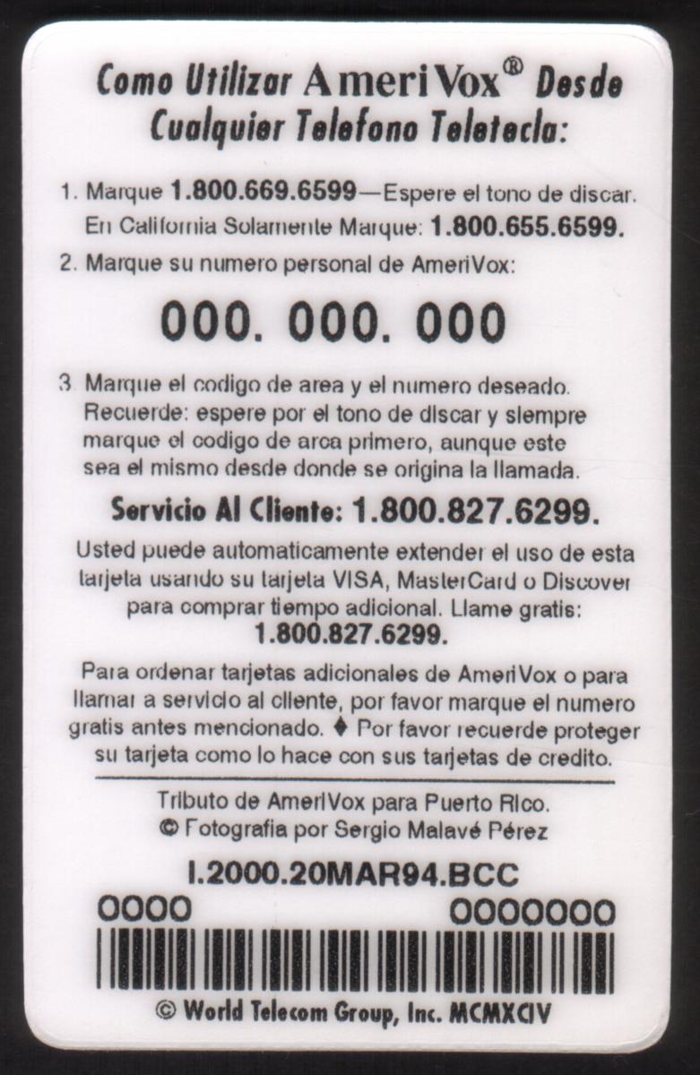 This card is part of a promotional series featuring international flags, American territories, American protectorates, and US territories. It includes a Spanish Reverse design, as indicated by the text in the keywords. It is not a bank card or Visa Cash card but a collectible phone card issued by AmeriVox.