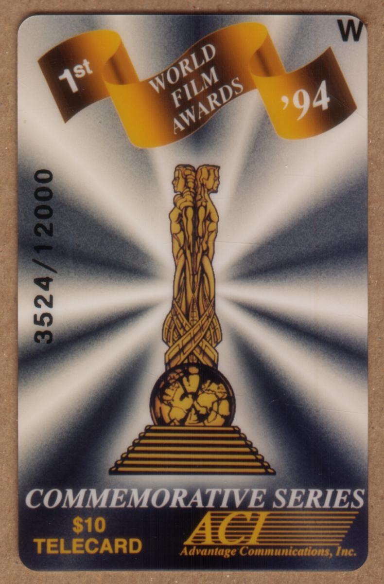 This collectible phone card features a central gold statuette from the World Film Awards, standing on a stepped pedestal. The statuette depicts three stylized human figures standing back-to-back atop a globe. Above this image is a golden ribbon banner with "1st WORLD FILM AWARDS '94" prominently displayed, indicating the card commemorates the first World Film Awards held in 1994.