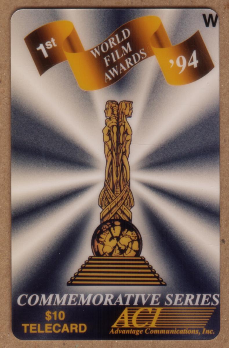 This collectible telephone card is a $10 telecard issued by Advantage Communications, Inc. (ACI). It is part of the Commemorative Series honoring the 1st World Film Awards held in 1994. The card features a central golden statue emblem standing on a stepped pedestal with intricate details, depicting three interwoven human figures embracing around a globe element near the base. This statue is the central visual element, set against a dynamic background of radiating white and blue rays that create a spotlight effect.