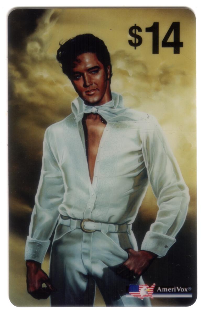 This collectible card features a detailed, painted portrait of Elvis Presley wearing a white outfit, including a partially open white shirt and white pants with a belt. The image presents Elvis with dark, slicked-back hair against a moody, cloud-filled background, evoking a dramatic atmosphere. The top right corner of the card displays the denomination "$14" in bold black text.