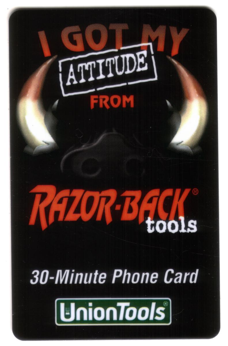 Below the Razor-Back tools logo, the card specifies its use as a "30-Minute Phone Card" in white text. At the bottom, the UnionTools logo appears inside a green and white rectangular box, emphasizing the connection to the Union Tools brand. The overall design is centered and crisp, with a strong emphasis on the Razor-Back tools identity and the user’s attitude inspired by it.