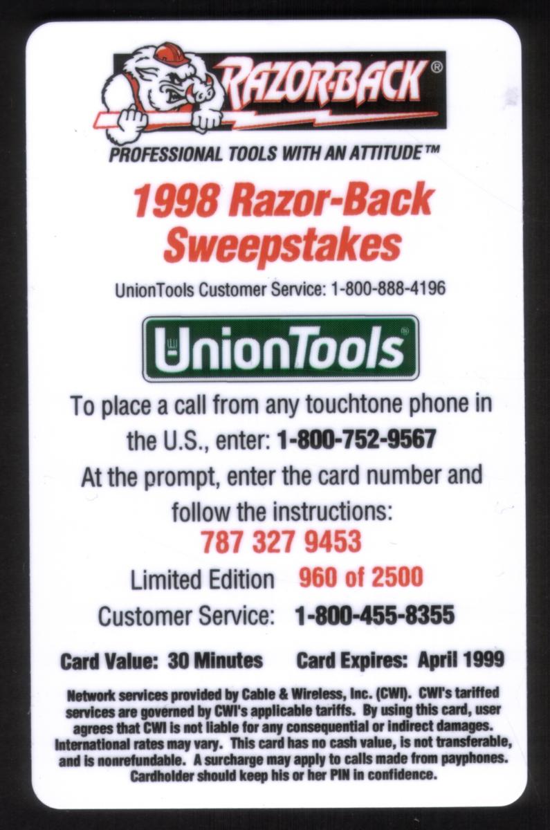 This card was issued by Cable & Wireless and is a collectible item linked to the 1998 Razor-Back Sweepstakes campaign. The combination of the Razor-Back tools theme and UnionTools branding makes it a distinctive collectible for fans of the brand or those interested in promotional phone cards from that period.