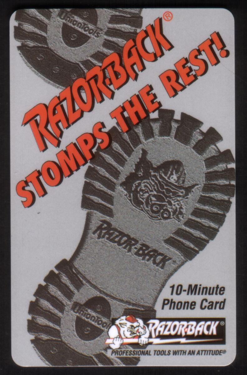 This collectible phone card features a bold promotional design for the RazorBack brand of professional tools by Union Tools. The primary image is a large footprint of a rugged work boot sole, rendered in a metallic gray shade, detailed with the RazorBack name on the arch area and an artistic depiction of a wild razorback hog wearing a hard hat centered in the sole pattern. The boot print symbolizes toughness and durability, aligning with the brand’s theme.