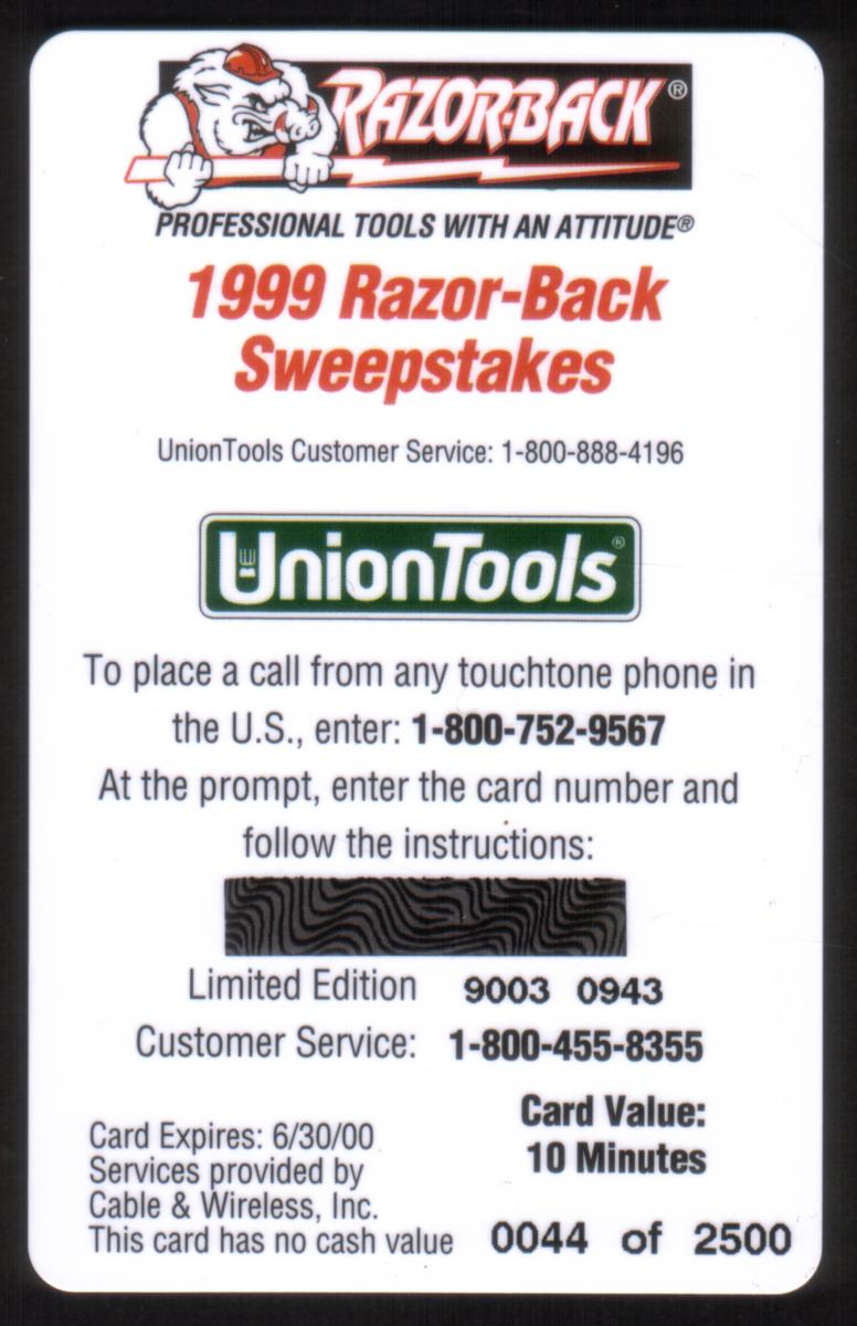At the bottom center, the RazorBack logo appears with the tagline, “Professional Tools With An Attitude®,” accompanied by a cartoon-style image of a muscular razorback hog gripping a wrench, reinforcing the brand identity. The Union Tools brand name is also visible near the heel of the boot print. This phone card is associated with the 1999 Razor-Back Sweepstakes promotion by Union Tools, emphasizing an aggressive, hard-working image for the company’s professional tool line.