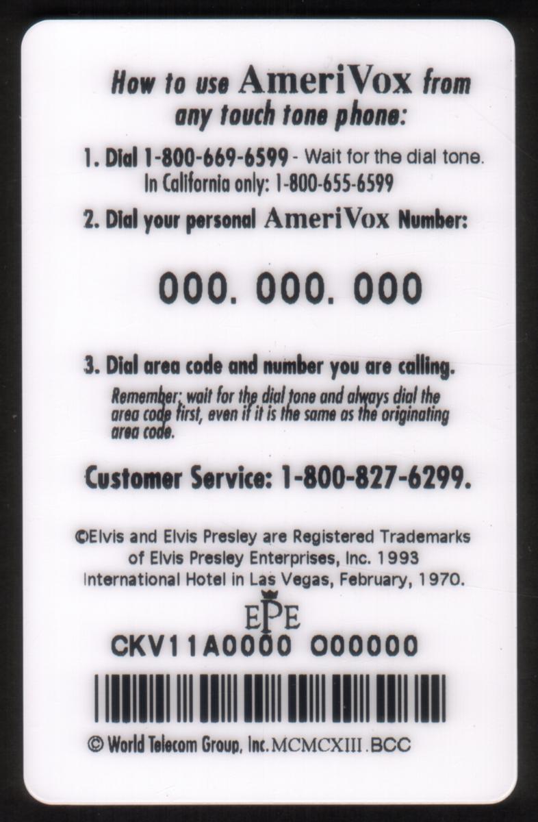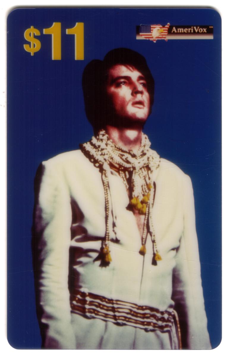 The card includes a printed value of $11 in bold yellow characters in the top left corner. In the top right corner, there is a small logo featuring the AmeriVox brand with an American flag and an eagle motif. The card captures the charisma and international fame associated with Elvis Presley and ties into themes related to Graceland, Hollywood, and his status as a globally recognized movie star and entertainer. The overall presentation pays homage to Elvis Presley Enterprises (EPE) and the legacy of Elvis Presley.