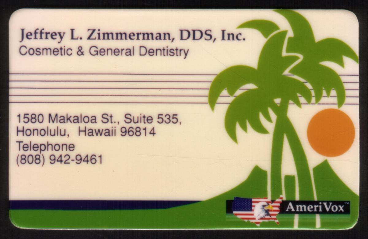 This collectible medical promotional card features the details for Jeffrey L. Zimmerman, DDS, Inc., specializing in Cosmetic & General Dentistry. The card provides the office address at 1580 Makaloa St., Suite 535, Honolulu, Hawaii 96814, along with the telephone number (808) 942-9461. The official text is printed in a clear, professional font on a light background.