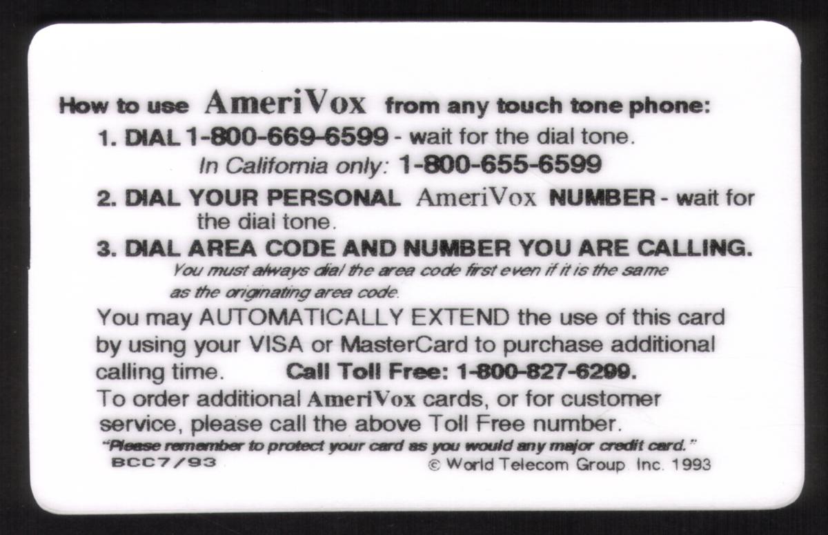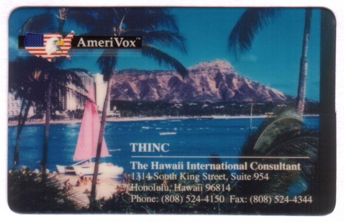 The card is issued by AmeriVox and includes contact information for The Hawaii International Consultant (THINC) located at 1314 South King Street, Suite 954, Honolulu, Hawaii 96814. Phone numbers listed are (808) 524-4150 and fax (808) 524-4344. The date on the card is 07/93.