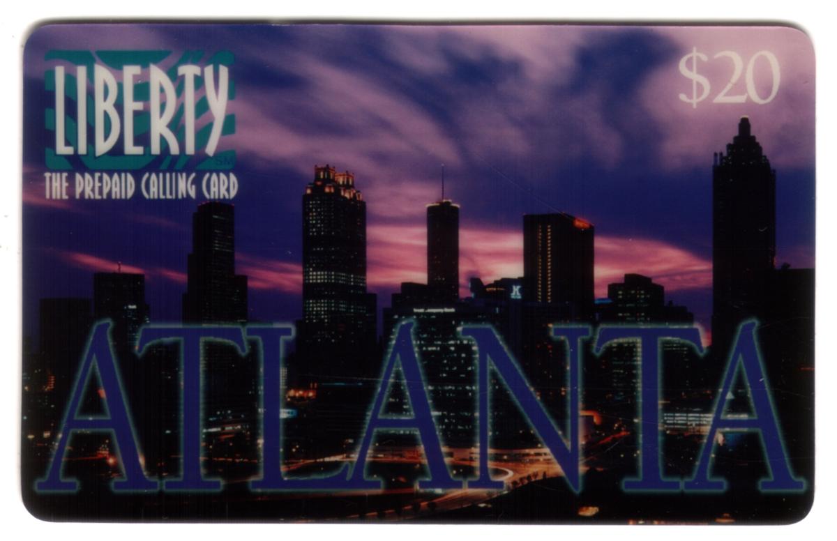 The card’s denomination is $20, displayed in the upper right corner in white font. The word "ATLANTA" is prominently featured across the bottom half in large, bold capital letters with a blue outline and black fill. In the upper left corner, the card includes the text "LIBERTY" in white capital letters with a stylized letter “I” resembling the Statue of Liberty torch. Beneath it is the smaller text "THE PREPAID CALLING CARD" in white.