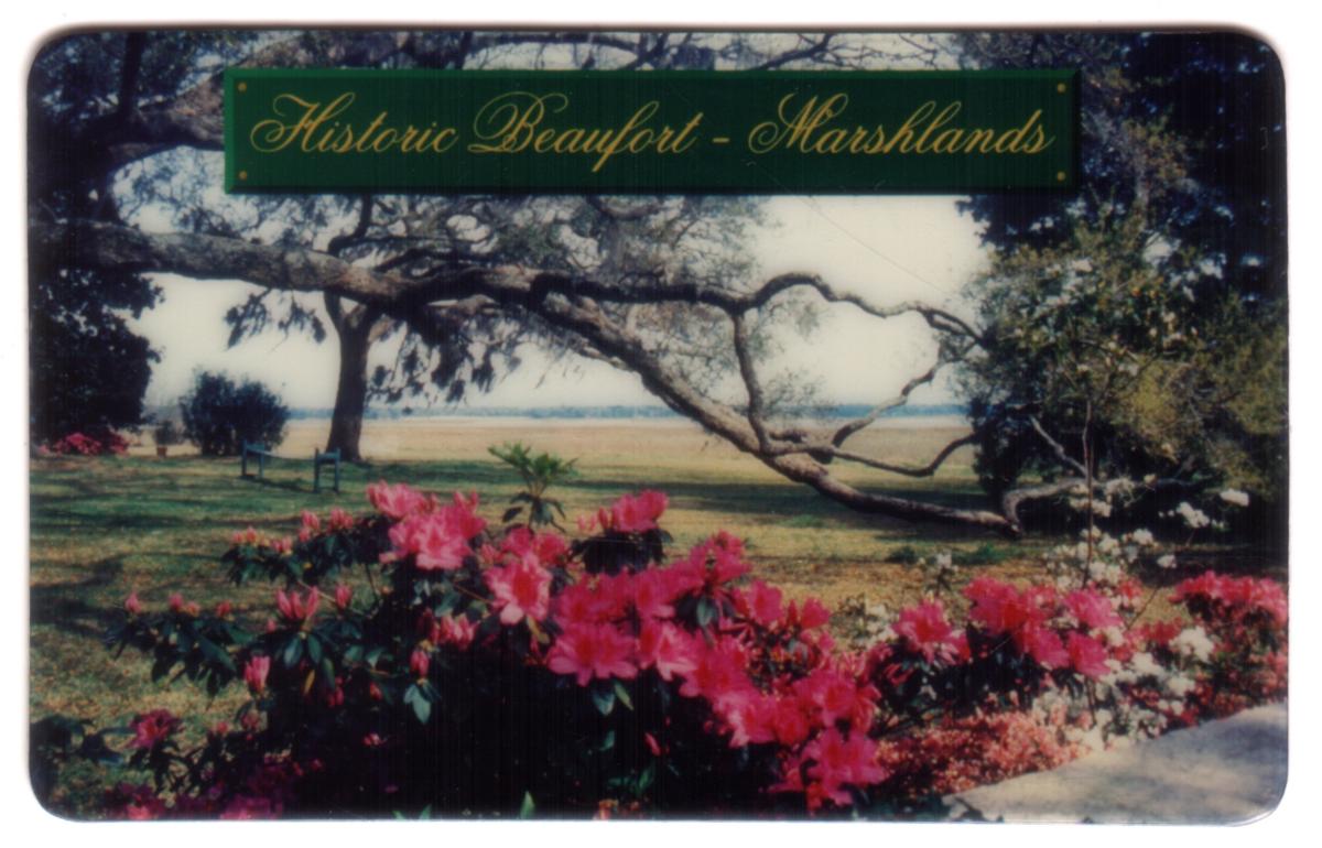 This collectible card features a scenic view of the Historic Beaufort Marshlands in South Carolina. The image prominently displays vibrant pink flowers in the foreground, set against an open marshland landscape with expansive grassy areas extending towards the horizon. A large, sprawling tree branch stretches across the top portion of the image, adding natural framing to the serene outdoor scene.