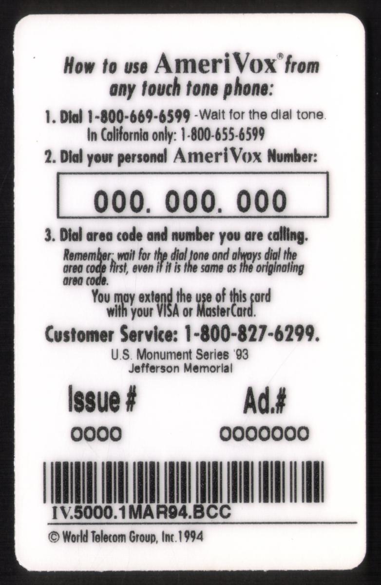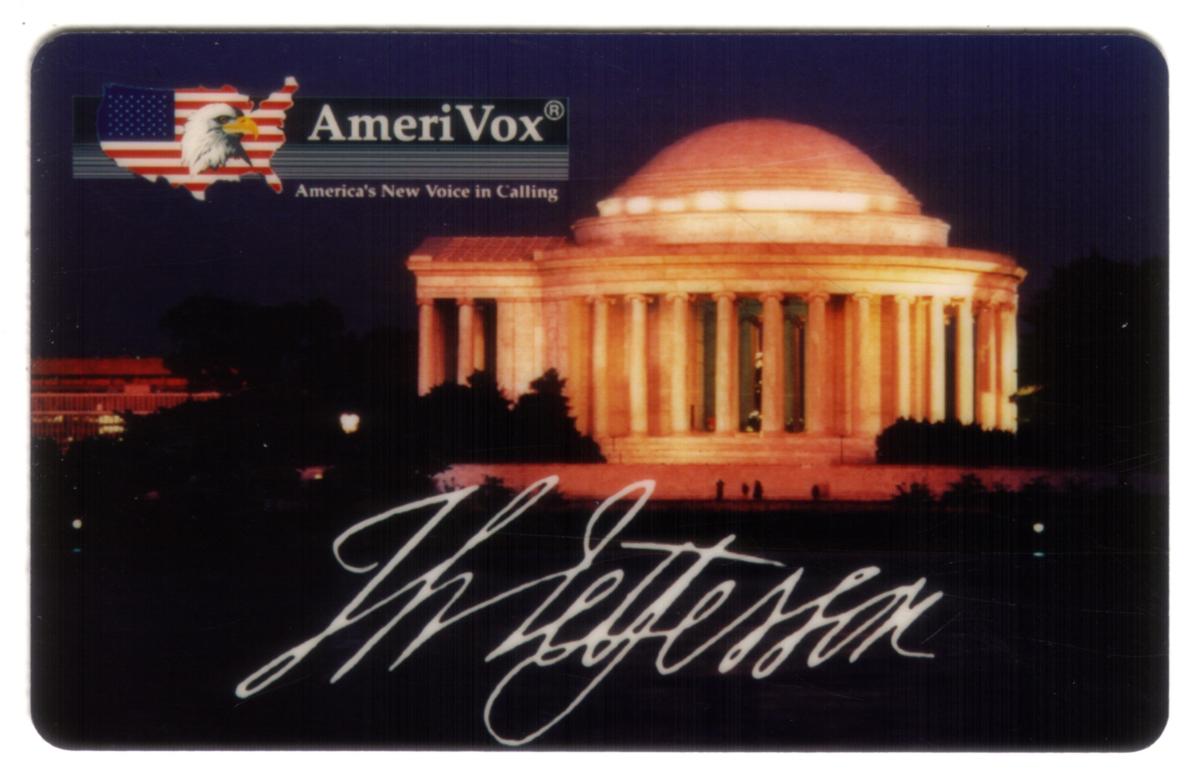 The phone card displays the AmeriVox logo in the upper left corner. This logo consists of an American flag design integrated with the continental United States outline and a bald eagle’s head, accompanied by the tagline "America’s New Voice in Calling." Below the memorial image is a facsimile of Thomas Jefferson’s signature, adding a historical and patriotic element to the card.