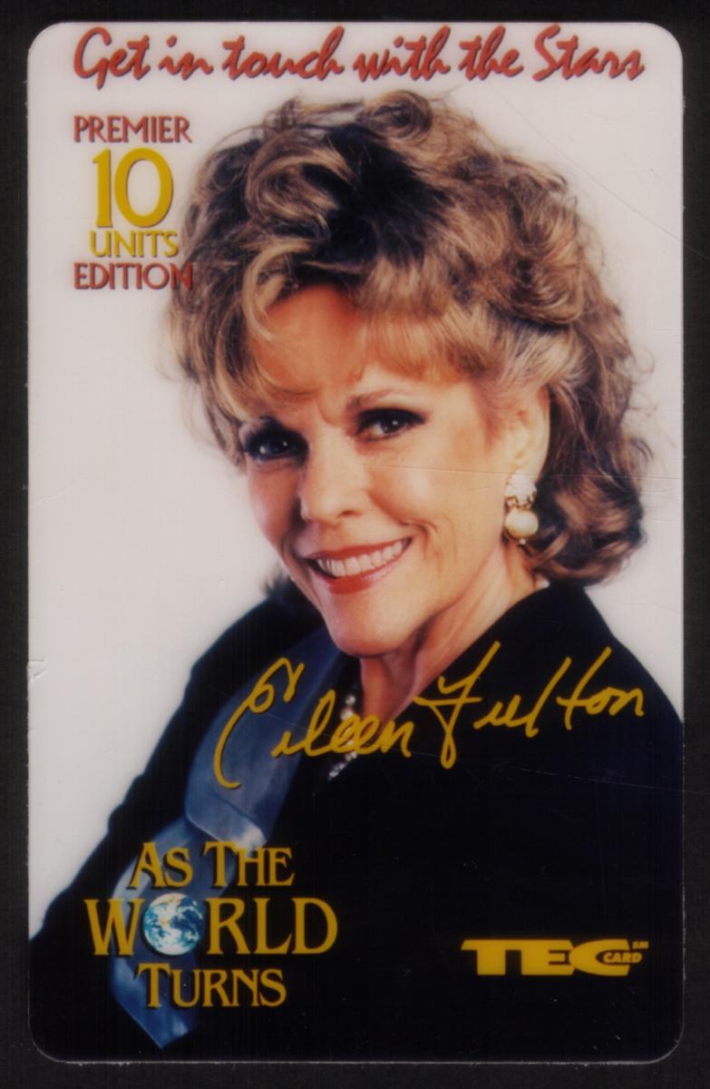 This collectible phone card features an image of Eileen Fulton, known for her role as Lisa in the daytime television soap opera "As The World Turns." The card has the phrase "Get in touch with the Stars" printed in red at the top. It is marked as a "Premier 10 Units Edition," indicating a unit value for phone use. Eileen Fulton’s name is prominently displayed in a yellow signature-style script across her image. The "As The World Turns" logo appears near the bottom left corner, with a globe incorporated into the word "World." The logo for TEC, the card issuer, is positioned in the bottom right corner.