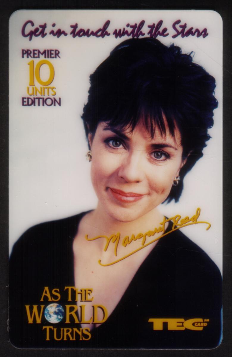 This collectible phone card features a photographic portrait of Margaret Reed, who portrayed the character Shannon on the daytime soap opera "As The World Turns." The card has the words "Get in touch with the Stars" written at the top in a stylized cursive font. It indicates it is a "Premier 10 Units Edition," displayed in gold lettering on the left side near the top.