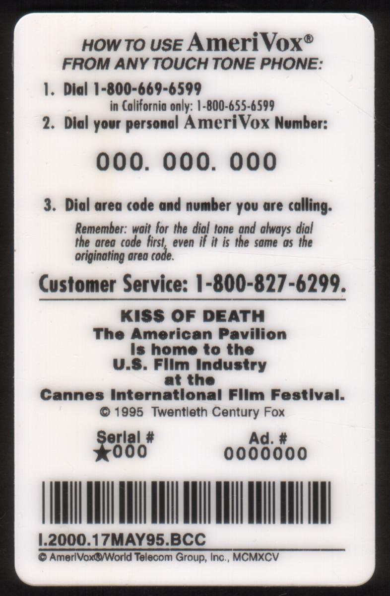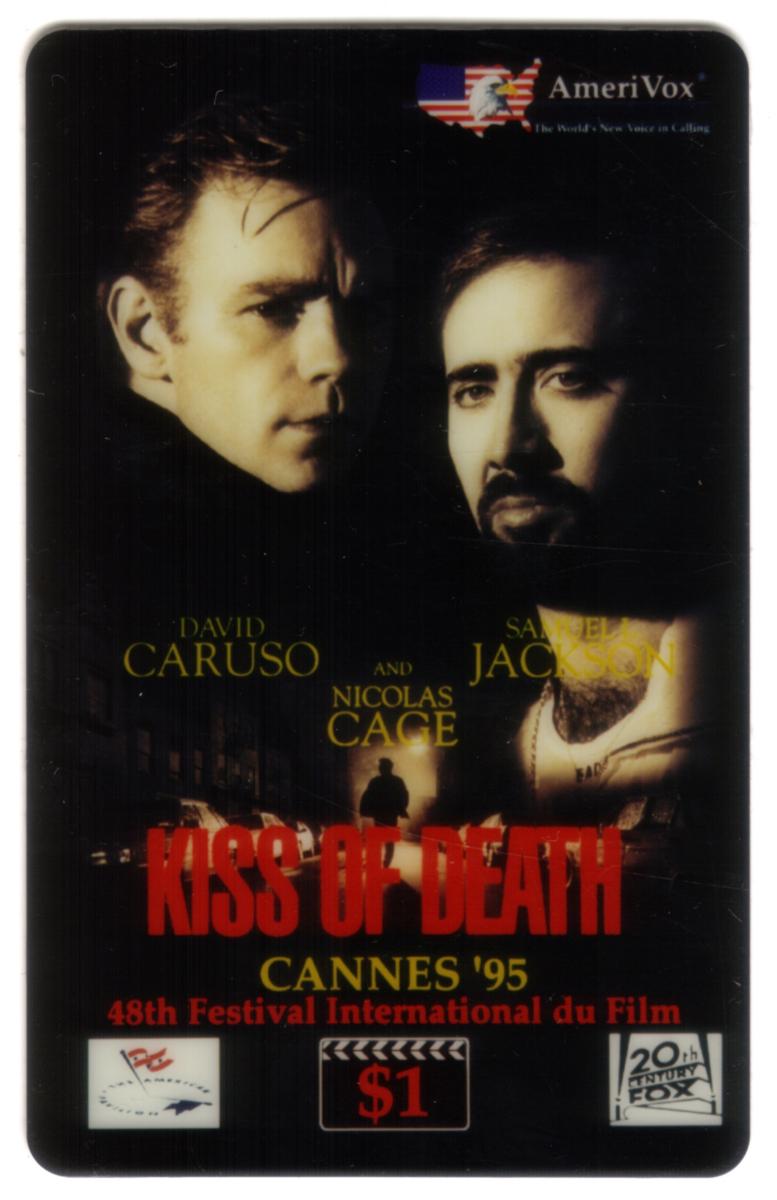 The title "KISS OF DEATH" is displayed in bold red letters near the bottom center of the card. Beneath it, the text "CANNES '95 48th Festival International du Film" appears in yellow. The card’s value is printed as "$1" within a small clapperboard icon, denoting its use as a collectible phone card with a stored monetary value. Logos for AmeriVox and 20th Century Fox are visible in the upper right and lower right corners, respectively, affirming its official entertainment and cinema association.