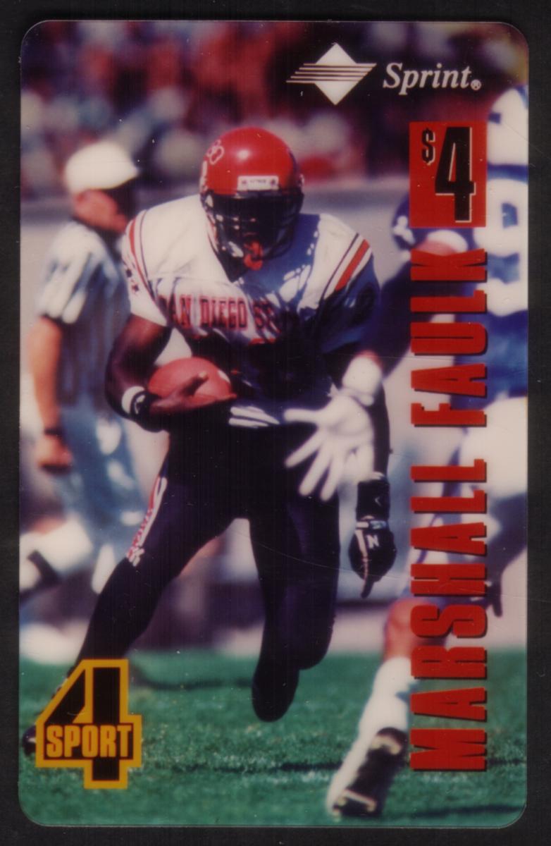 This collectible phone card features Marshall Faulk, a football player, in action on the field. He is wearing his San Diego State uniform, which includes a white jersey with red and black accents and a red helmet displaying the number 4 on the front. Faulk is holding the football securely in his right arm, while his left hand is open and ready, indicating movement and athleticism. The card captures an intense moment during a game, with a blurred background showing the presence of other players and a referee.